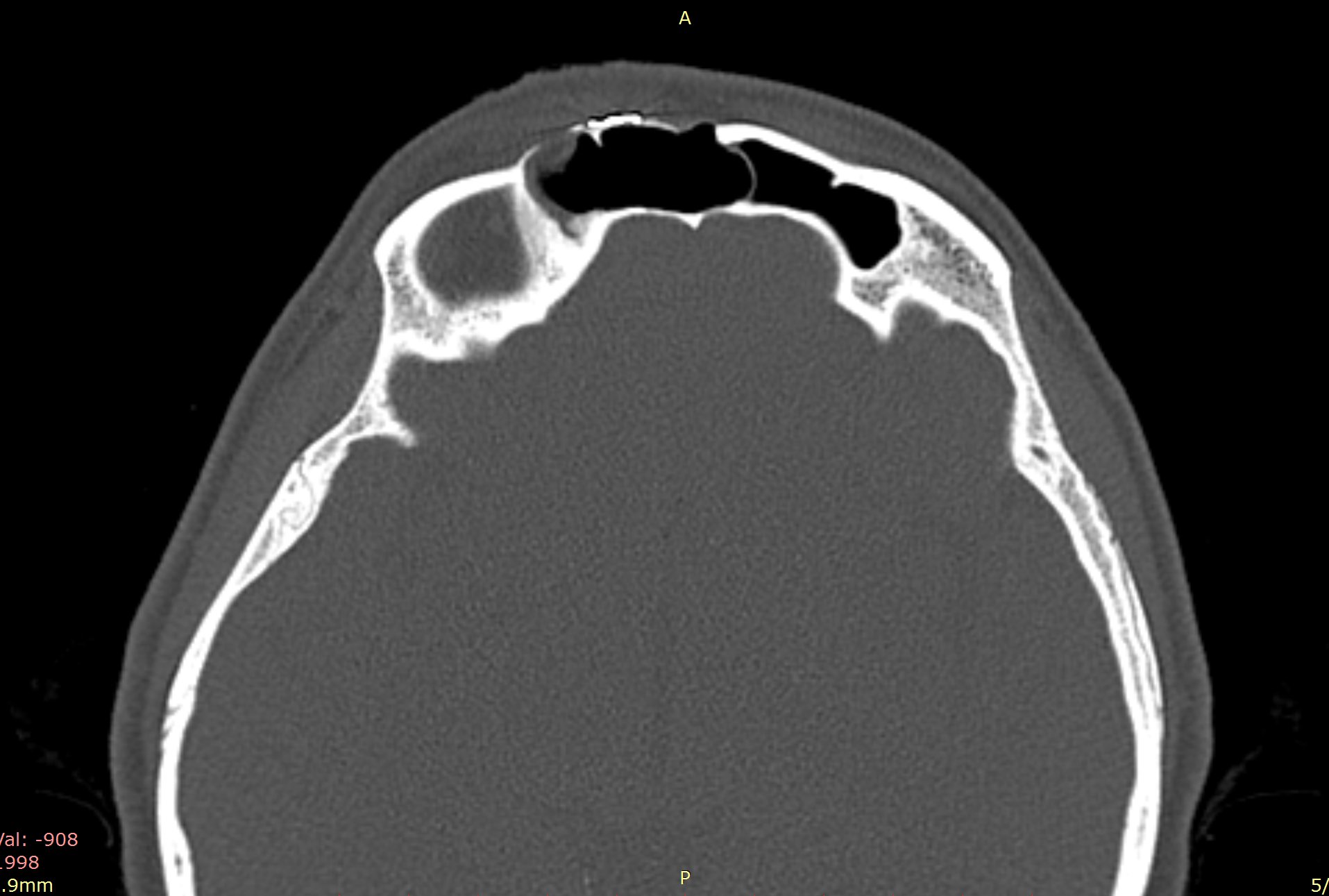 Pacienta C.M., în vârstă de 42 de ani, se prezintă la spital pentru cura chirurgicală a unei formațiuni tumorale osteomatoase de sinus frontal drept extinsă la nivelul orbitei. Tabloul clinic include asimetrie orbitară cu exoftalmie inferolaterală oculară dreaptă și afirmativ fenomene de diplopie.