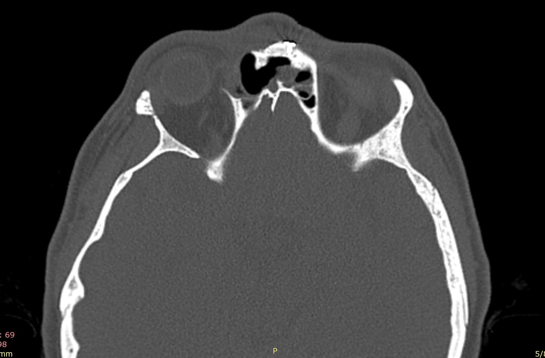 Examenul clinic ORL și examenele imagistice complementare (CT, RMN sinusuri paranazale) pun în evidență o formațiune tumorală osteogenică a sinusului frontal drept, protruzivă în unghiul supero-intern al orbitei, extinsă medial către sinusul frontal stâng.