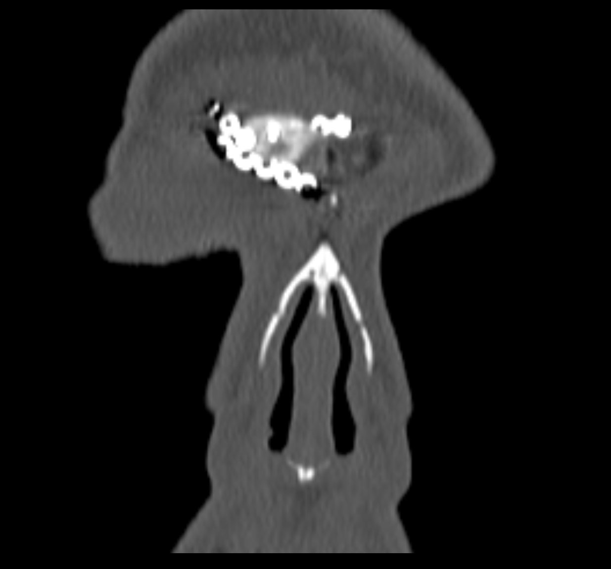 - Refacerea planurilor prin aplicarea grefonului osos prelevat de la nivelul peretelui anterior sinus frontal drept fixat în 3 puncte prin punți și șuruburi Stryker din titan biocompatibile/compatibile RMN. Sutură în două planuri: profundă fasciomusculară și intradermică. Aplicare de bandă adezivă Steri-Strip la nivelul inciziei.
