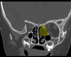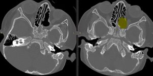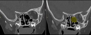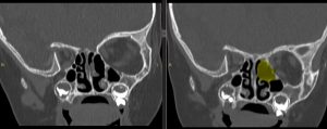 Figura 1: Secțiuni CT preoperatorii in plan axial si coronal, evidențiind tumora etmoido‑orbitală stângă.