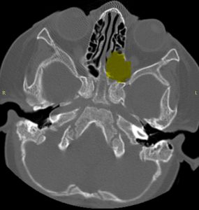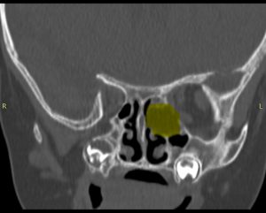 - Formațiune tumorală etmoido‑orbitală stângă, cu extensie spre vârful orbitei;